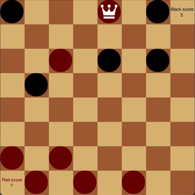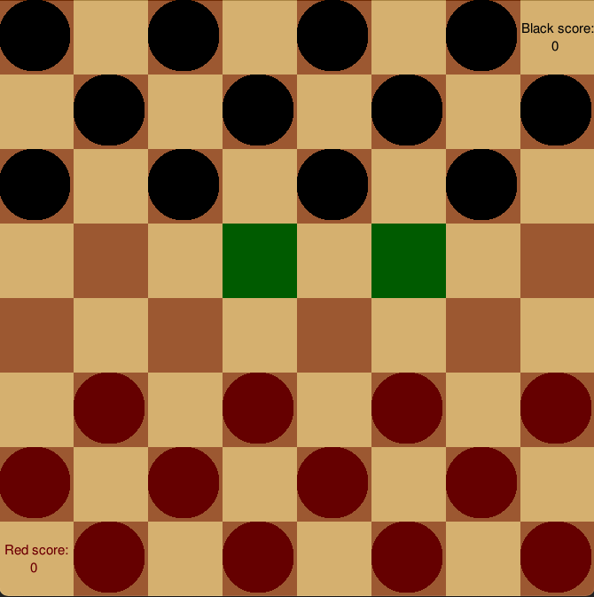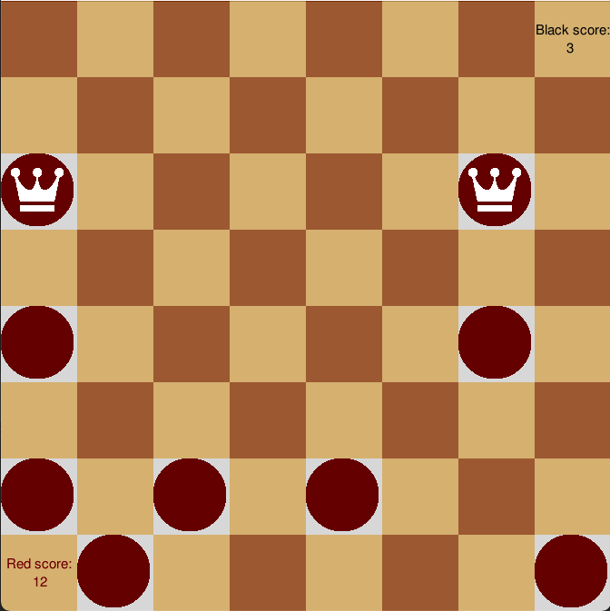 - The game has a scoreboard initialized to zero for both players, every time a checker is eaten, the other player gains one point.